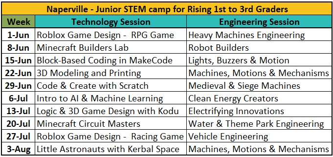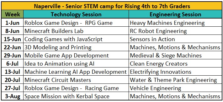 • Each day of camp includes 1/2 a day of technology and 1/2 a day of Engineering with outdoor recess